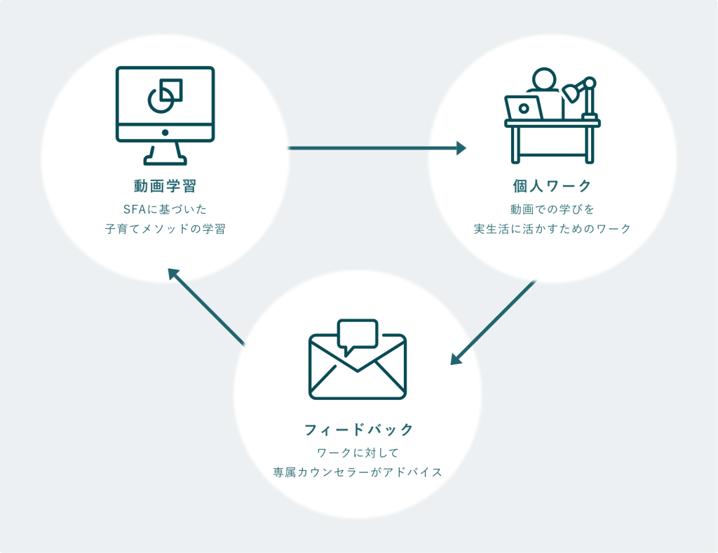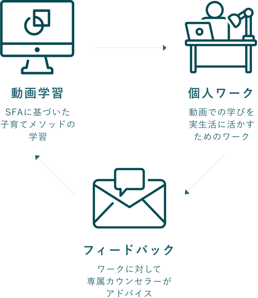 動画を通して学んだ考え方を元に、実際の目の前のお子さんのことを考えながら、課題を行っていきます。その個人ワークそのものが、親としての力を養うことになります。